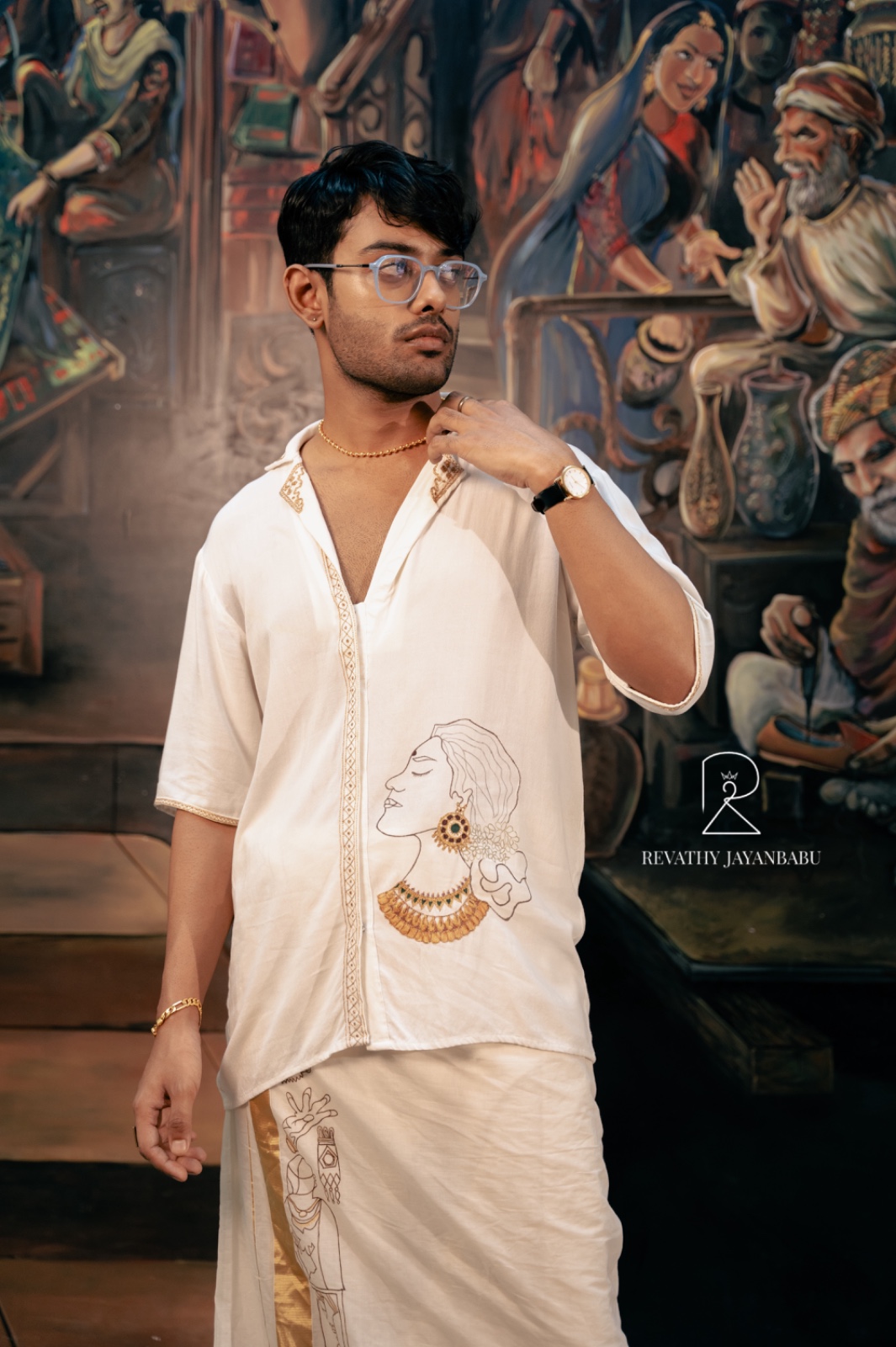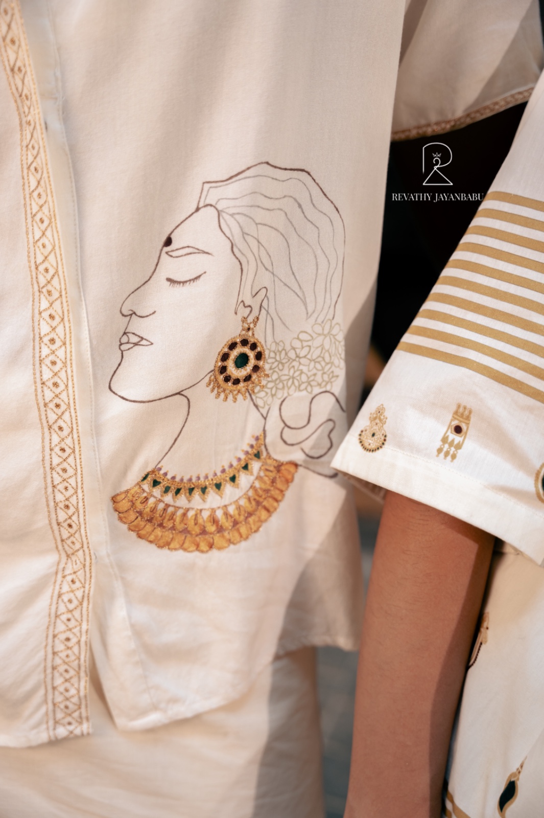 - The off-white shirt features a captivating line-art embroidery and handpainting