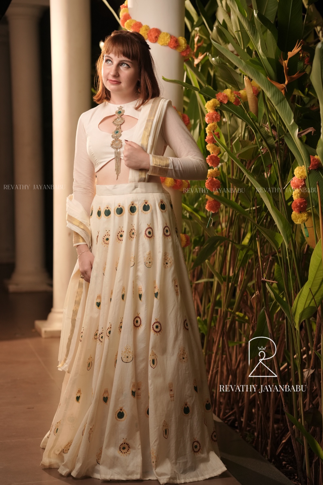 A celebration of grace and craftsmanship, this refined ivory lehenga set blends the essence of Kerala’s festive charm with contemporary sophistication.