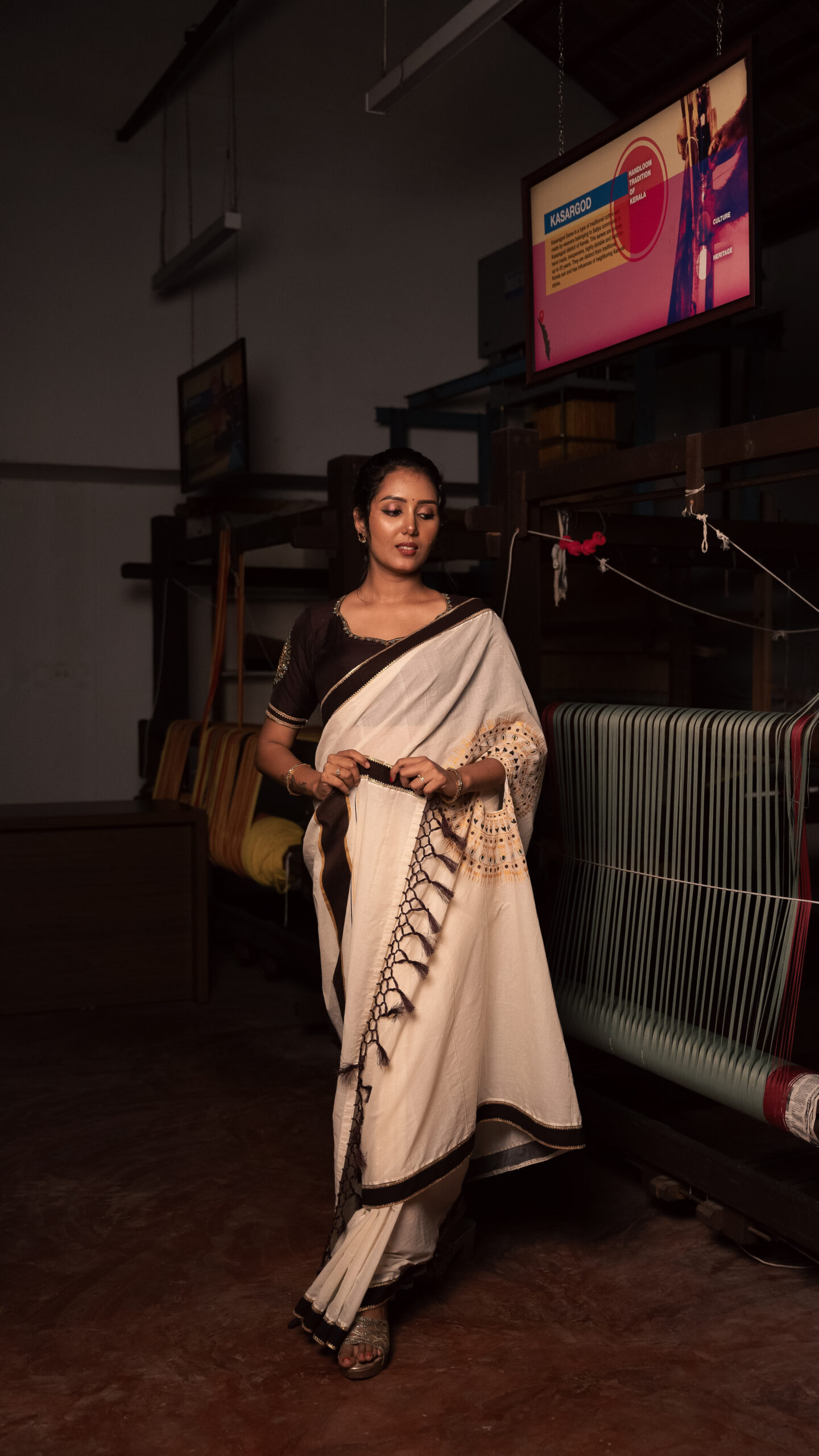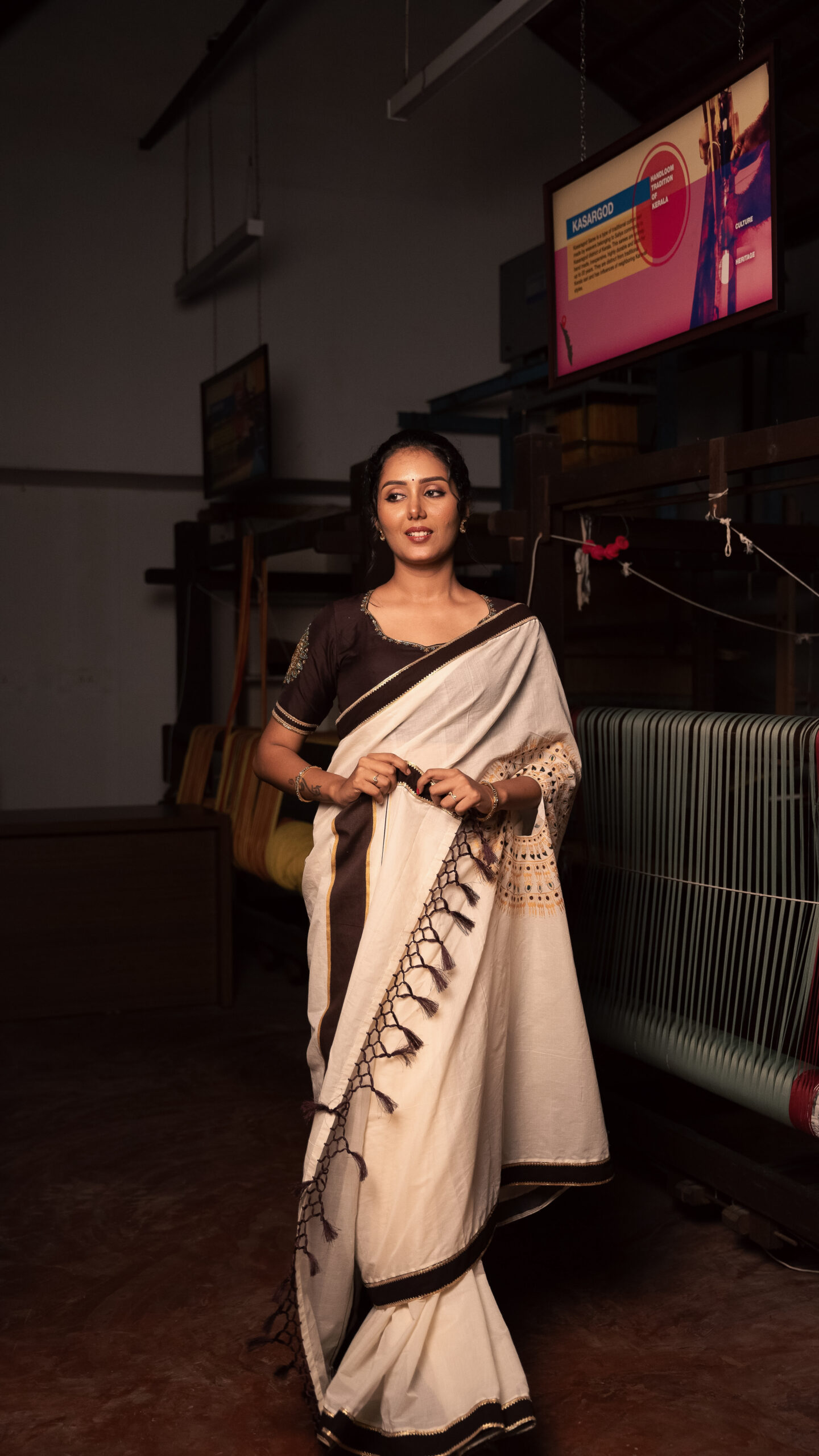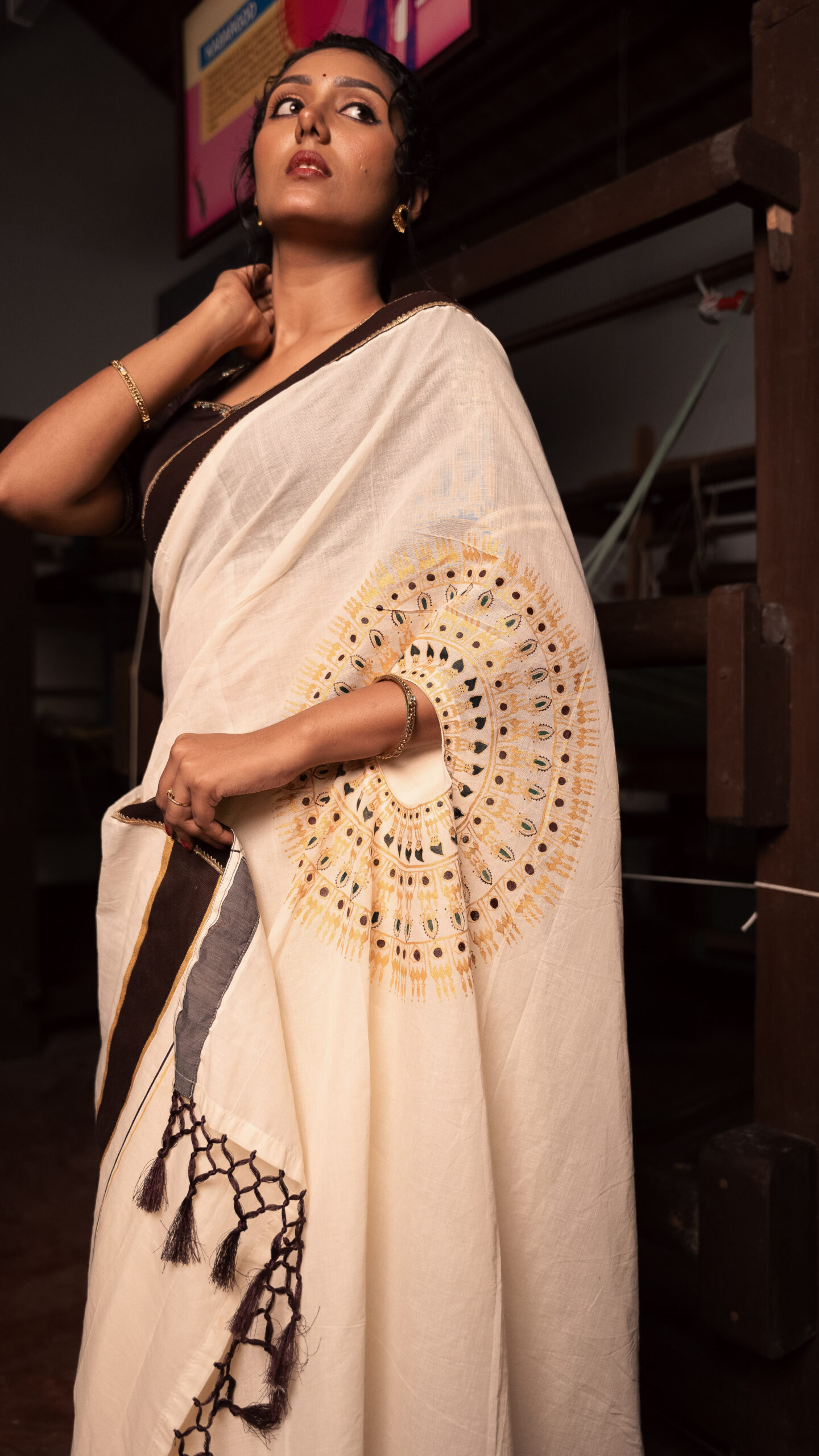 • Paired with a contrasting dark brown blouse, the ensemble is a perfect blend of heritage craftsmanship and contemporary appeal.
