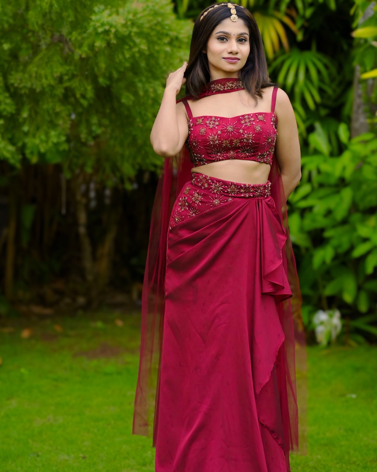 - Paired with flowy pre-draped skirt with Hand embroidery.
