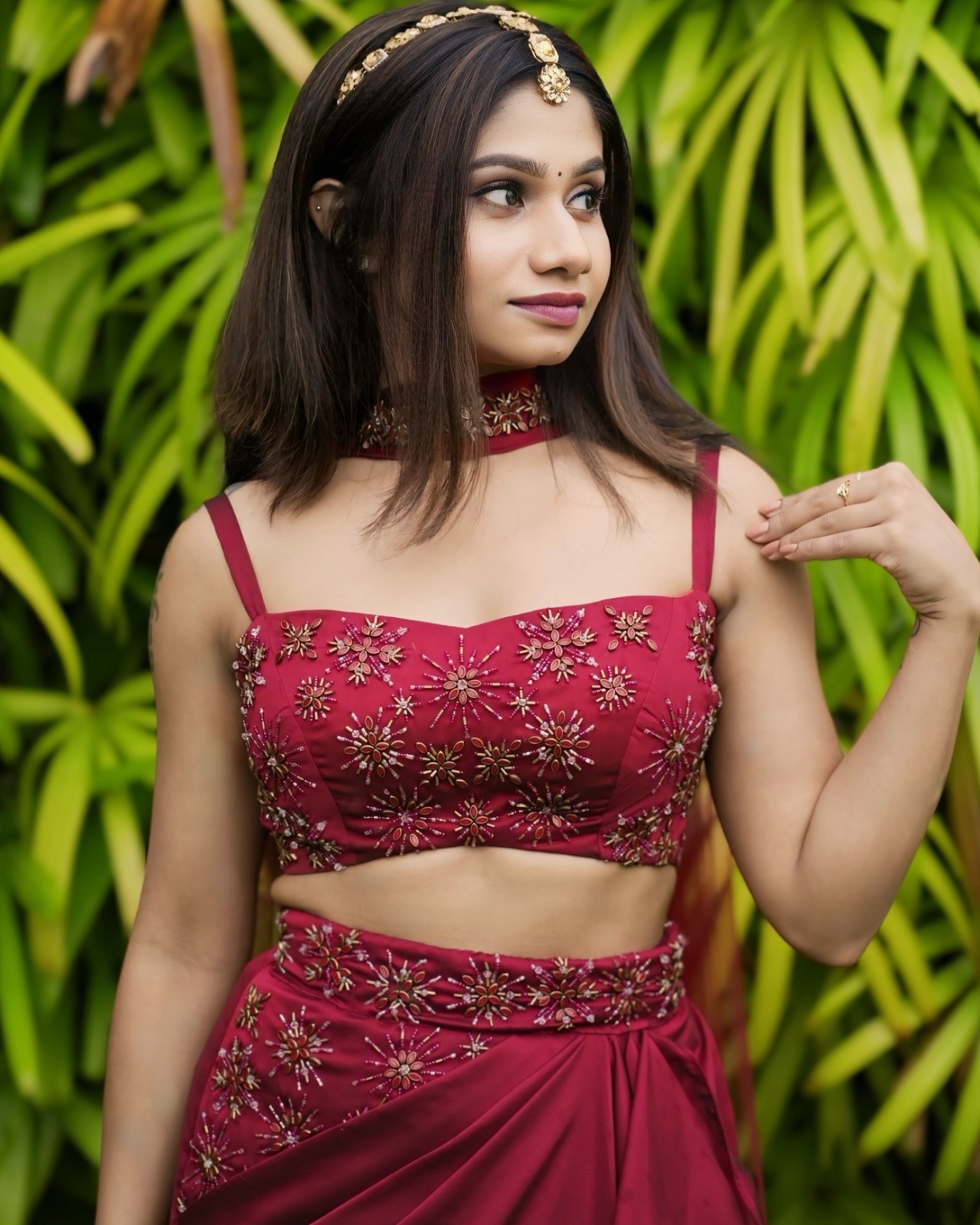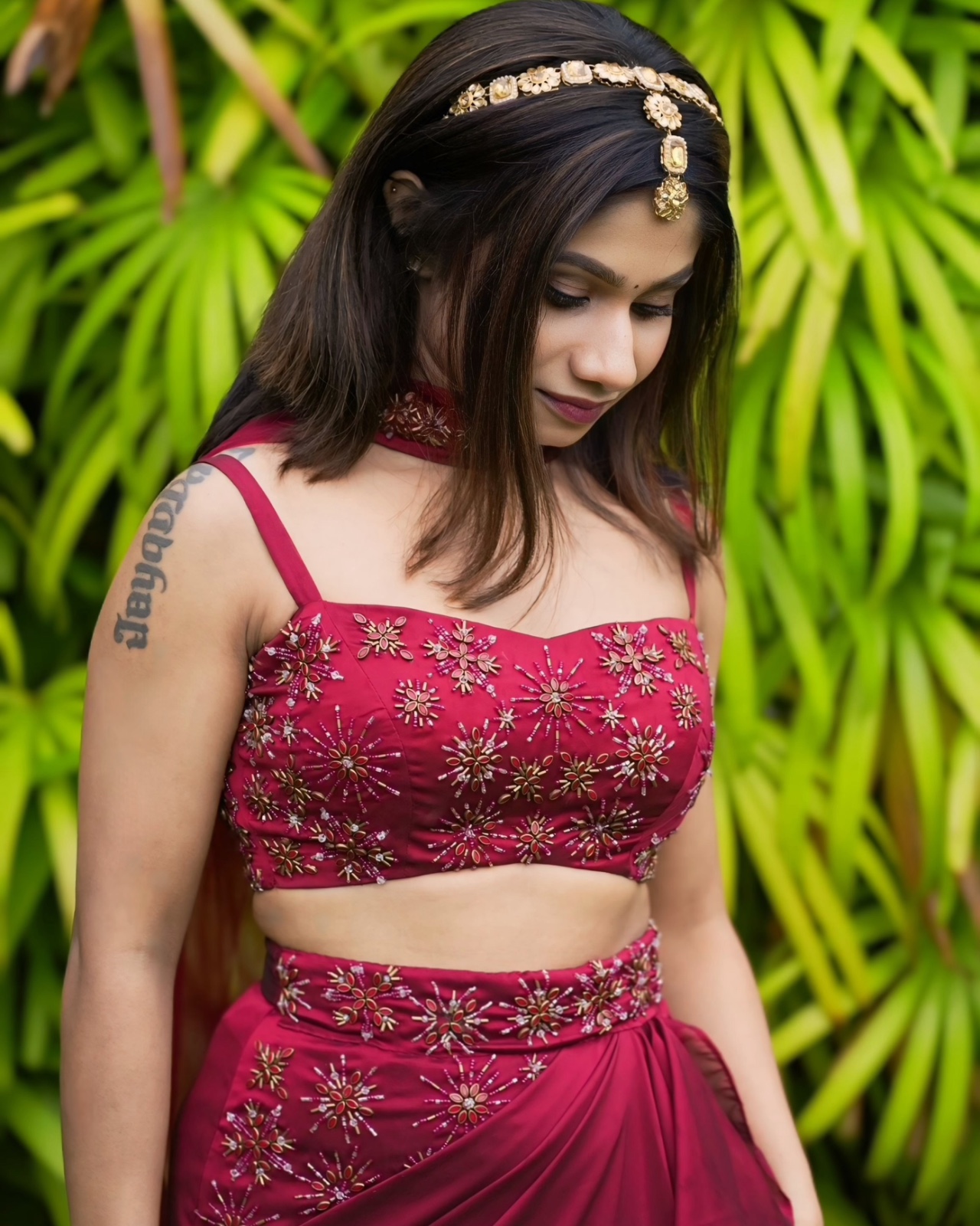 - Hand embroidered crop blouse adorned with intricate floral motifs.