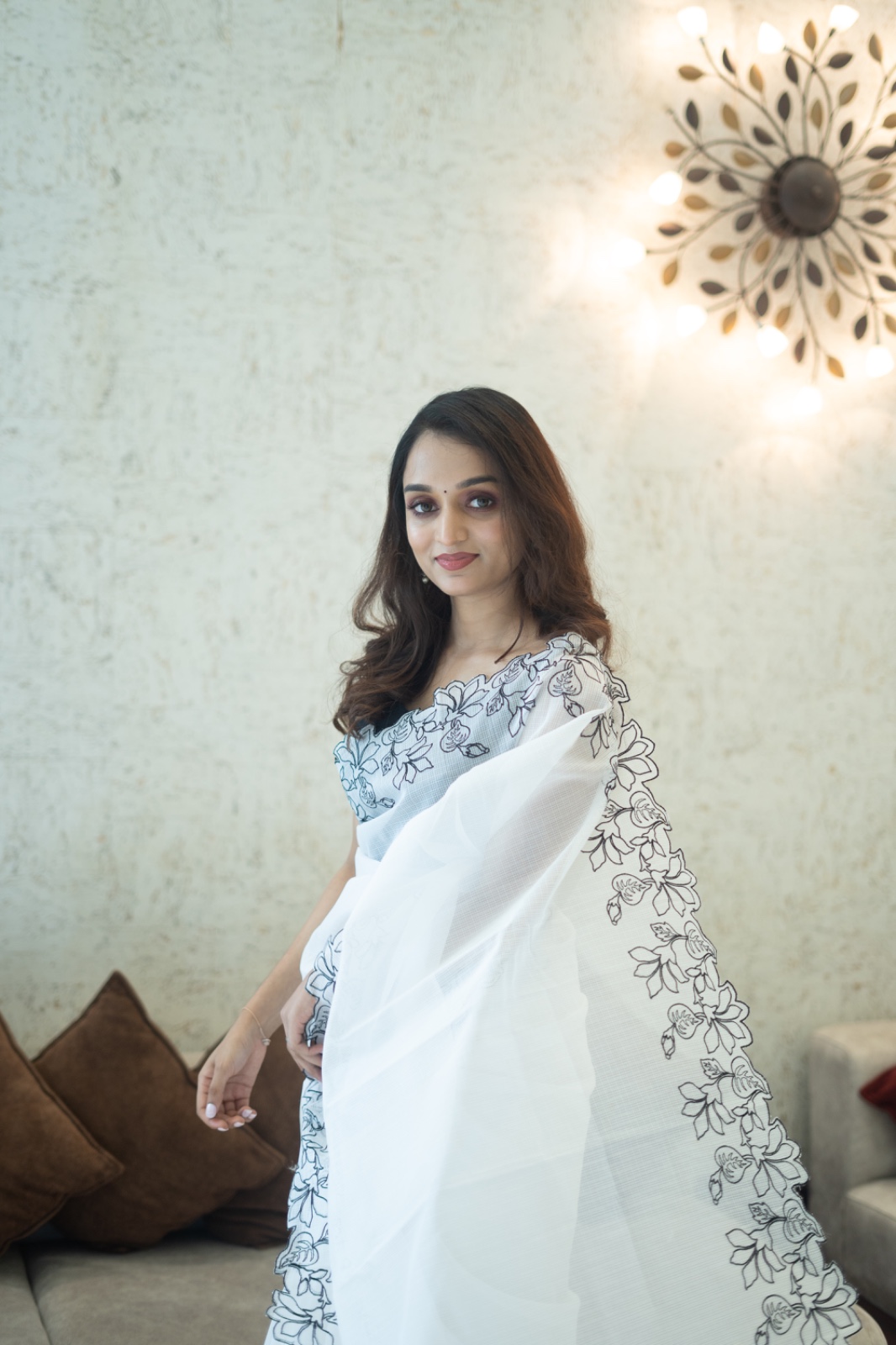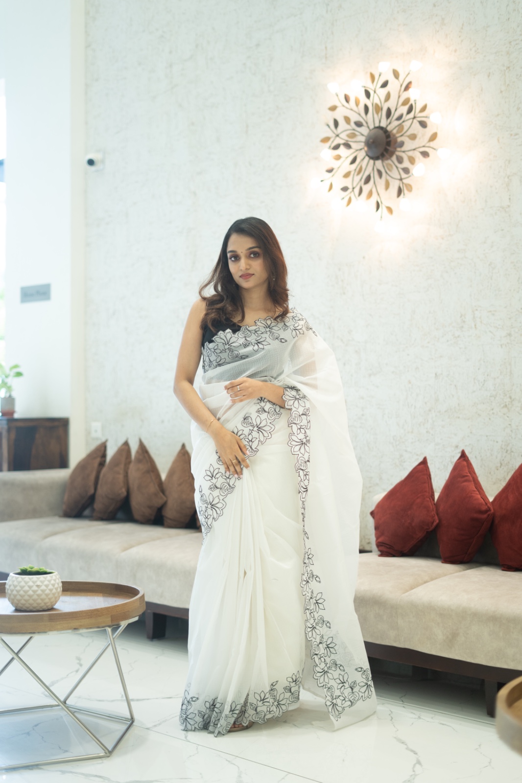 - Intricate Black Floral Embroidery on Borders and Pallu